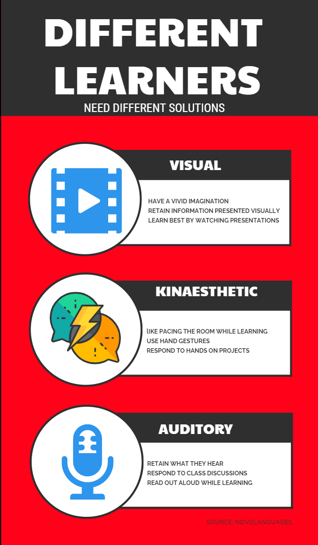 The Novolanguages method is all about matching learning typologies. Instructors conduct classes using a methodology suited to the learner. For groups or cohort classes all three typologies are included in proportion to the learners.